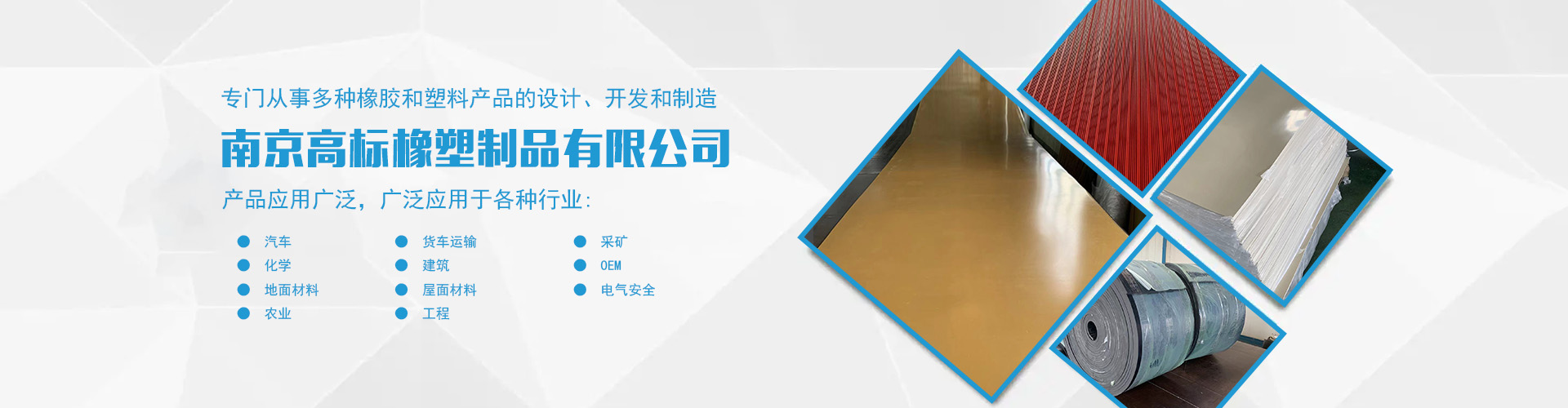 南京高標(biāo)橡塑制品有限公司是一家專業(yè)的橡膠板、橡膠制品和熱塑性塑料產(chǎn)品的制造商。主營產(chǎn)品:三元乙丙橡膠板,丁腈橡膠版,氯丁橡膠板,丁苯橡膠板,丁基橡膠板,天然橡膠板,硅橡膠板,氟橡膠板,絕緣,防靜電,導(dǎo)電橡膠板,夾布,夾金屬網(wǎng)橡膠板,耐酸堿橡膠板,耐油橡膠板,耐磨橡膠板,阻燃橡膠板,阻尼橡膠板,減震橡膠板,防滑橡膠板,橡膠墊片等。 高標(biāo)橡塑專門從事多種橡膠和塑料產(chǎn)品的設(shè)計、開發(fā)和制造。我們的產(chǎn)品應(yīng)用廣泛。廣泛應(yīng)用于各種行業(yè),包括:汽車,貨車運(yùn)輸,采礦,化學(xué),建筑,OEM,地面材料,屋面材料,電氣安全,農(nóng)業(yè),工程等。 高標(biāo)橡塑的客戶服務(wù)于許多行業(yè),包括墊片切割、分銷商、工業(yè)用品零售商和批發(fā)商。自